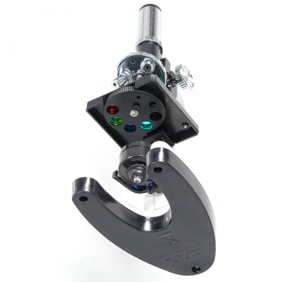 Детский оптический прибор с увеличением в 100-900 крат. На корпусе расположены зеркало и светодиодная лампа, которая автоматически включается при повороте зеркальной поверхности. Для детального изучения объекта исследования предусмотрена диафрагма и четыре фильтра. Устройство имеет основание из металла и подвижный тубус с окуляром и объективом. Питается микроскоп от 2 батареек формата АА. В комплекте есть специальный нож для вскрытия препаратов, компоненты для проведения опытов, емкости для выращивания живых микроорганизмов.